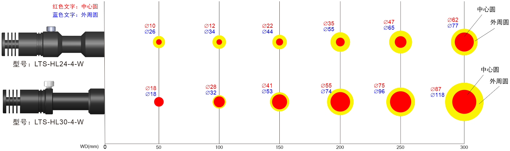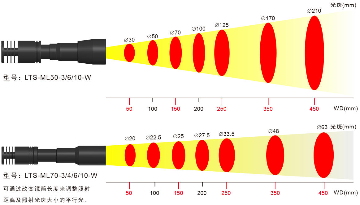 注:調光100%、光纖8mm光束,總長1100mm的直型光纖導管,從光纖出光口到各照射距離的位置的實測值(并非保證值)。