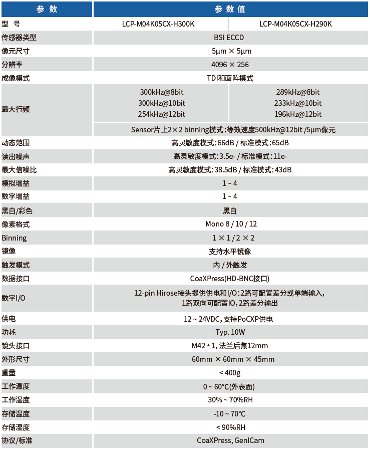 LCP-M04K05CX-H300K工業線陣相機,采用4096x256線TDI黑白ECCD Sensor,該Sensor同時兼具CCD TDI傳感器的高靈敏度、高信噪比以及CMOS TDI傳感器的高速度、低功耗的優點,代表業內最先進水平。除了普通相機版本之外,更是提供了近紅外相機版本,用以適應更多的工業應用場景。